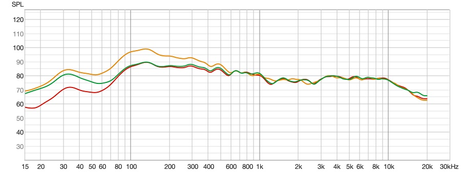 А вот тут красным, без boost, оранжевый с boost - тут видно, что весь диапазон до 600 Гц поднимается, включая самый низ. Но слушать невозможно. А зеленый - boost минус басы на 5 кликов. Не идеально, но лучше, чем как-то иначе.
