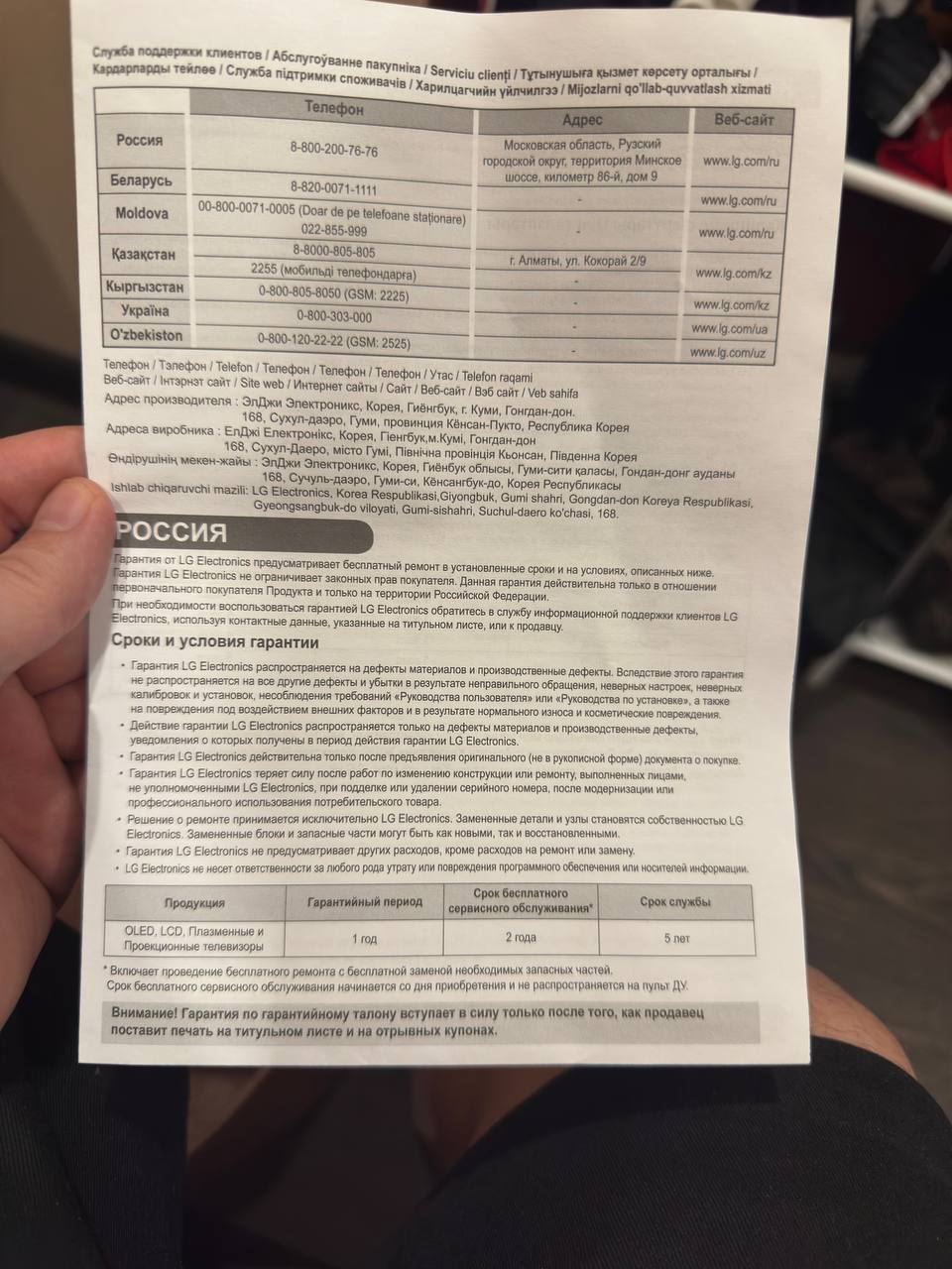 Если речь по EAC-сертификат, то он ничего не значит - если параллельный импорт, то только год от продавца. Могла быть (narpol @ Гарантия на телевизоры LG), но очень маловероятно, и официальная гарантия от российского представительства LGE в РФ (но и она истекла, как годичная уже). Но в любом случае нет бесплатного постгарантийного сервисного обслуживания (+1 год после окончания 1 года гарантии), т.к. это был "подарок" от российского завода-изготовителя на собственные изделия и на польскую сборку не распространяется.