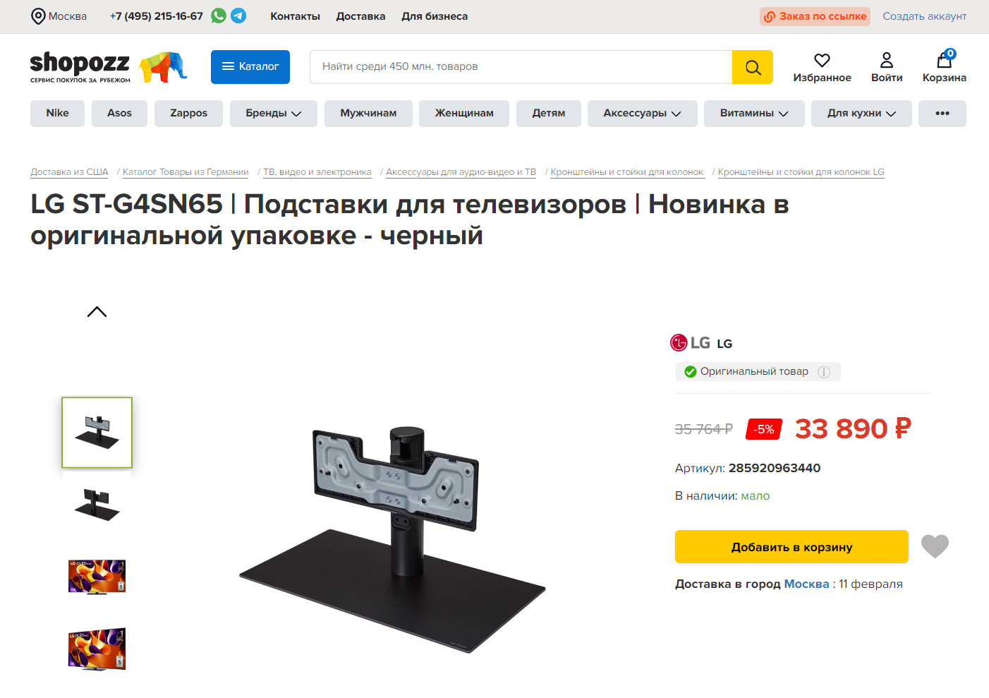 Оригинальную подставку LG ST-G4SN65 для LG OLED 65G4 можно купить через посредника shopozz.ru из Германии.