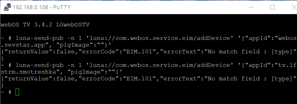 JackSparrow писал(а):kservice Ошибка "returnValue": false, "errorCode": "EIM.101", "errorText": "No match field: [type]" указывает на то, что в запросе отсутствует корректное поле type, которое требуется для метода addDevice в сервисе com.webos.service.eim. У вас перед webos.sevstar.app пробел зачем стоит?