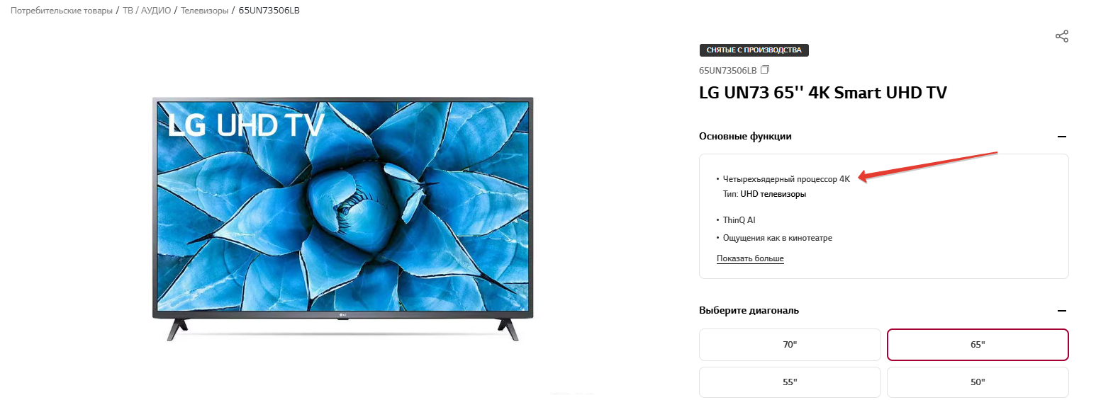 Ну можно и там искать, а можно пользоваться тем, что есть на форуме (например в сводных таблицах в Архивариус @ Телевизоры LG 2020 модельного года) или на сайте производителя, где, например, у BX https://www.lg.com/ru/televisions/lg-oled65bxrlbа у UN https://www.lg.com/ru/televisions/lg-65un73506lbRIV писал(а):Про процессор alpha 7 gen III... нашел инфу у продацов этого ТВ.. во многих местах.