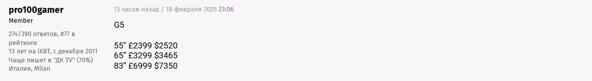 Просто интересно (чье-либо иное мнение), вроде в данном случае 48" и не "опилки" от новинок бОльших диагоналей (другие стек/панель) и копить не надо, но почему тогда на месяц позже выход у этого размера? Исключительно ИМХО, но реально что ли будет практически копия прошлогоднего С4 в таком размере, а задержка связана с необходимостью избавится от прошлогодних остатков таковой?AMETKO писал(а):разместил полную табличку по G5