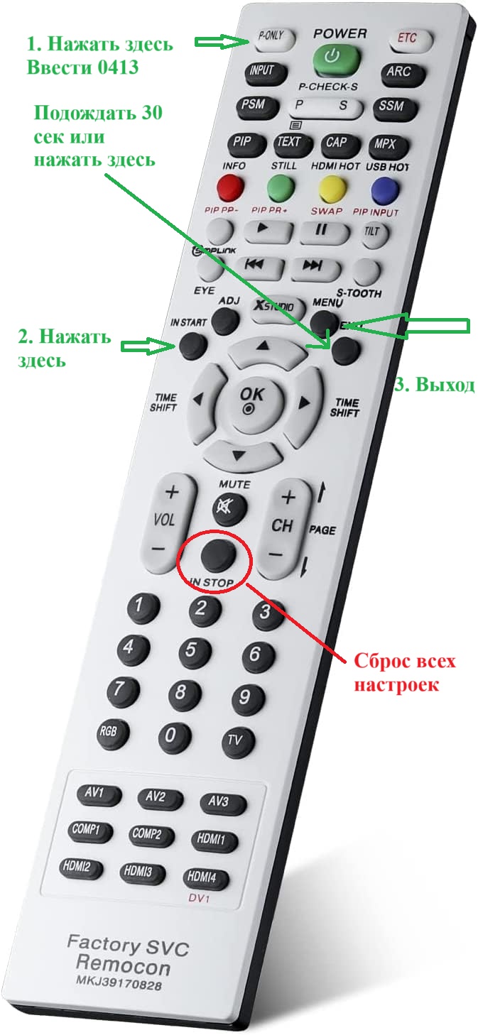 Для тех, кто пытается войти в сервисное меню LG со служебного пульта, наподобие Factory SVC Remocon MKJ39170828.