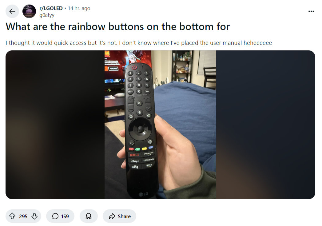 User64 писал(а):Если нажать все четыре кнопки одновременно перед зеркалом в полнолуние и прошептать 'LG Pride", пульт превращается в радужный световой меч.