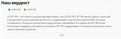 p.p.s. На rtings пишут, что LG SP11RA немного лучше, чем LG SN11RG. Панель SP11RA громче, в ней меньше компрессии на максимальной громкости, и она поддерживает подключение Apple AirPlay. В ней также больше предустановок эквалайзера. В то время как SN11RG имеет встроенную поддержку голосовых помощников, SP11RA поддерживает голосовых помощников только через сторонние устройства.