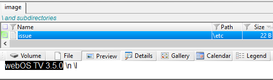 Шесть файлов SquashFS содержат стандартную версию LG webOS. Файл "/etc/issue" содержит версию операционной системы. В наборе данных он содержит "webOS TV 3.5.0".