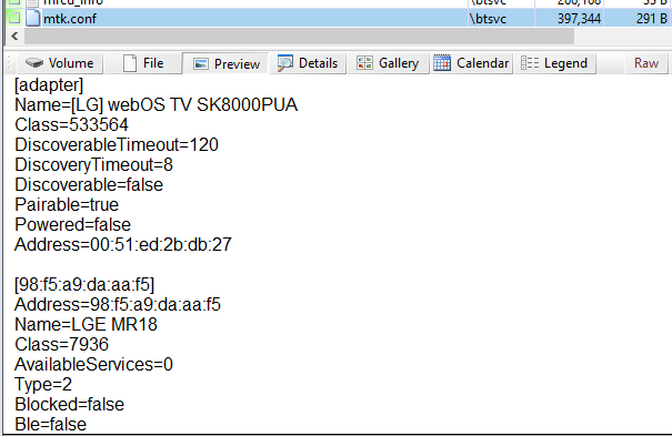 Файл "/btsvc/bluedroid-mtk/rec/bluedroid/bt_config.conf" содержит дополнительную информацию о сопряжённых устройствах.