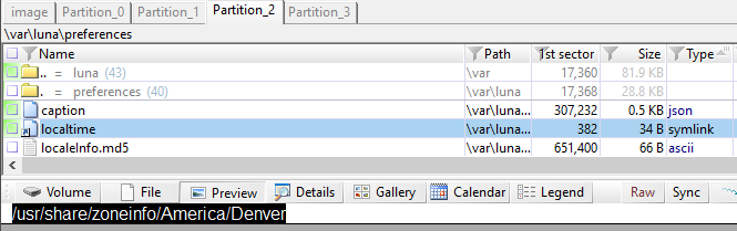 Файл "/var/luna/preferences/localtime" содержит информацию о местном часовом поясе. В предоставленном наборе данных "/usr/share/zoneinfo/America/Denver".