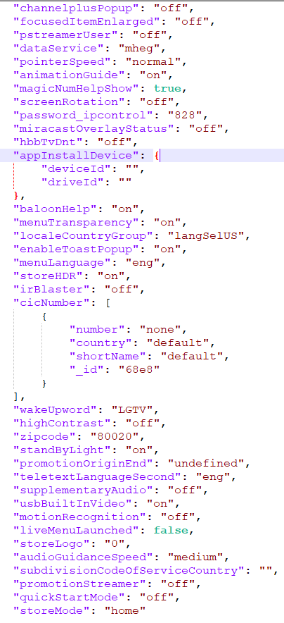 Файл "/var/luna/preferences/option" содержит различные настройки телевизора, в том числе почтовый индекс. В предоставленном наборе данных "80020" соответствует "Брумфилду, штат Колорадо", где находится VTO Labs.