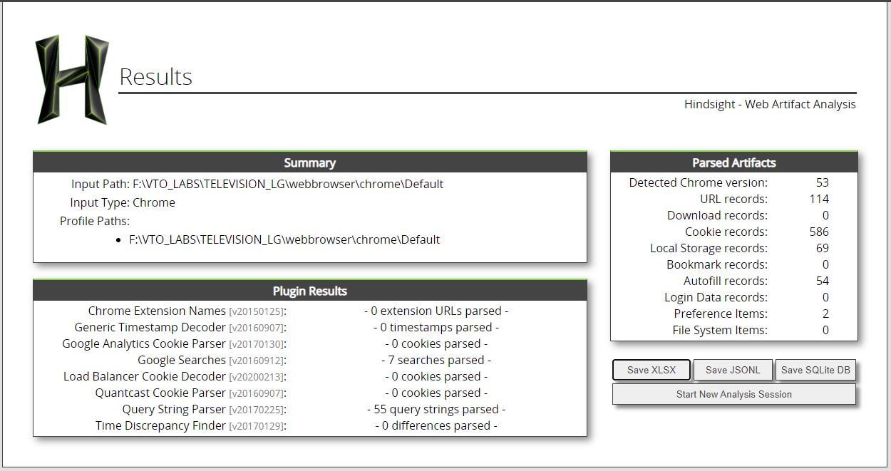 Папка "/webbrowser/chrome/Default" содержит внутренние данные веб-браузера. Веб-браузер webOS основан на Chromium, поэтому содержимое папки можно легко проанализировать с помощью Hindsight.
