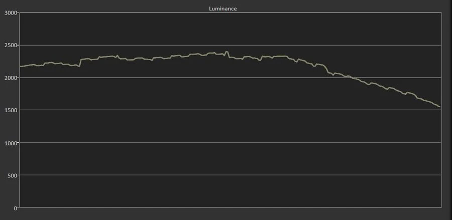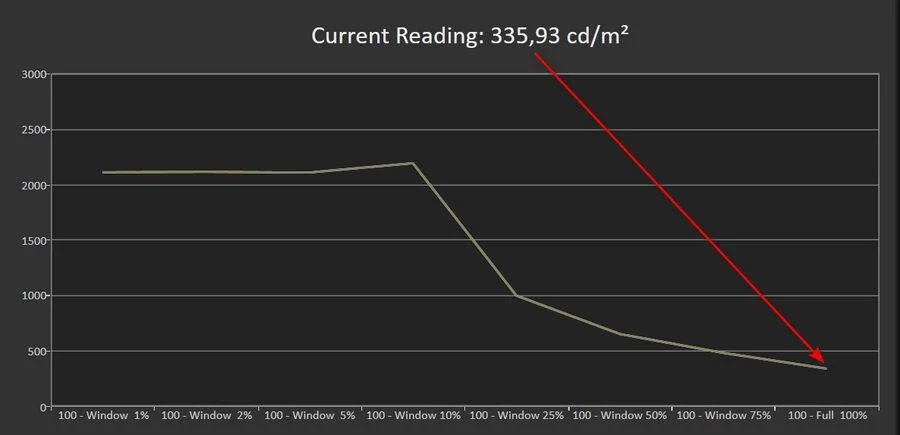 Телевизор (в 10% окне) способен поддерживать такую экстремальную яркость в течение 210 секунд (трёх с половиной минут), после чего она начинает снижаться, достигая 1576 кд/м? через пять минут после начала измерений. Это всё ещё выше, чем у 55G4, не говоря уже о базовых OLED-дисплеях.