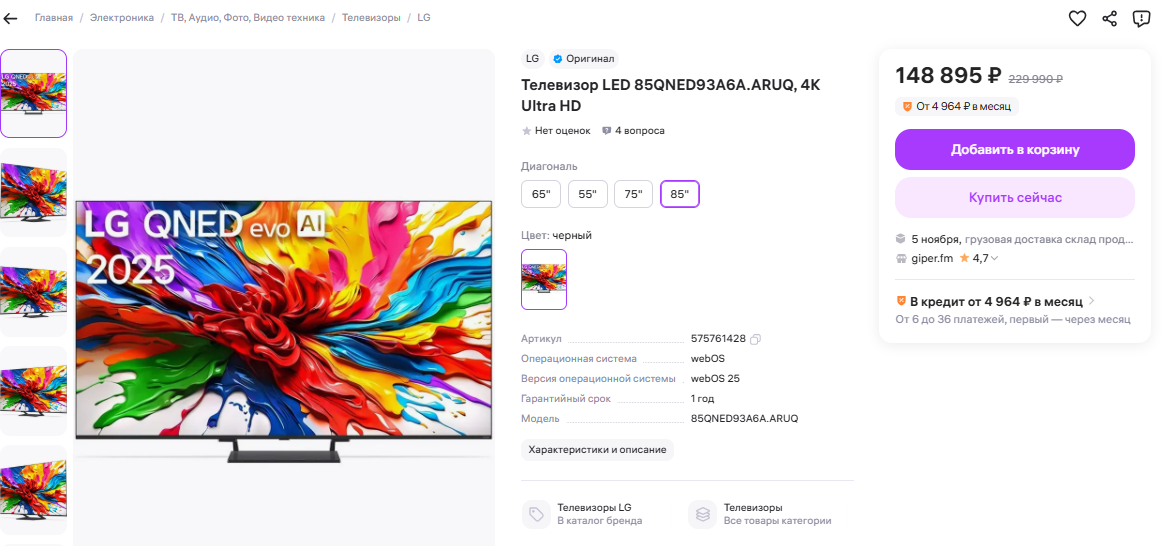 По данным сервиса Яндекс.Маркет в настоящий момент телевизоры серии LG QNED93 можно найти в интернет-магазинах Вашего региона по следующей стоимости (данные обновляются автоматически).