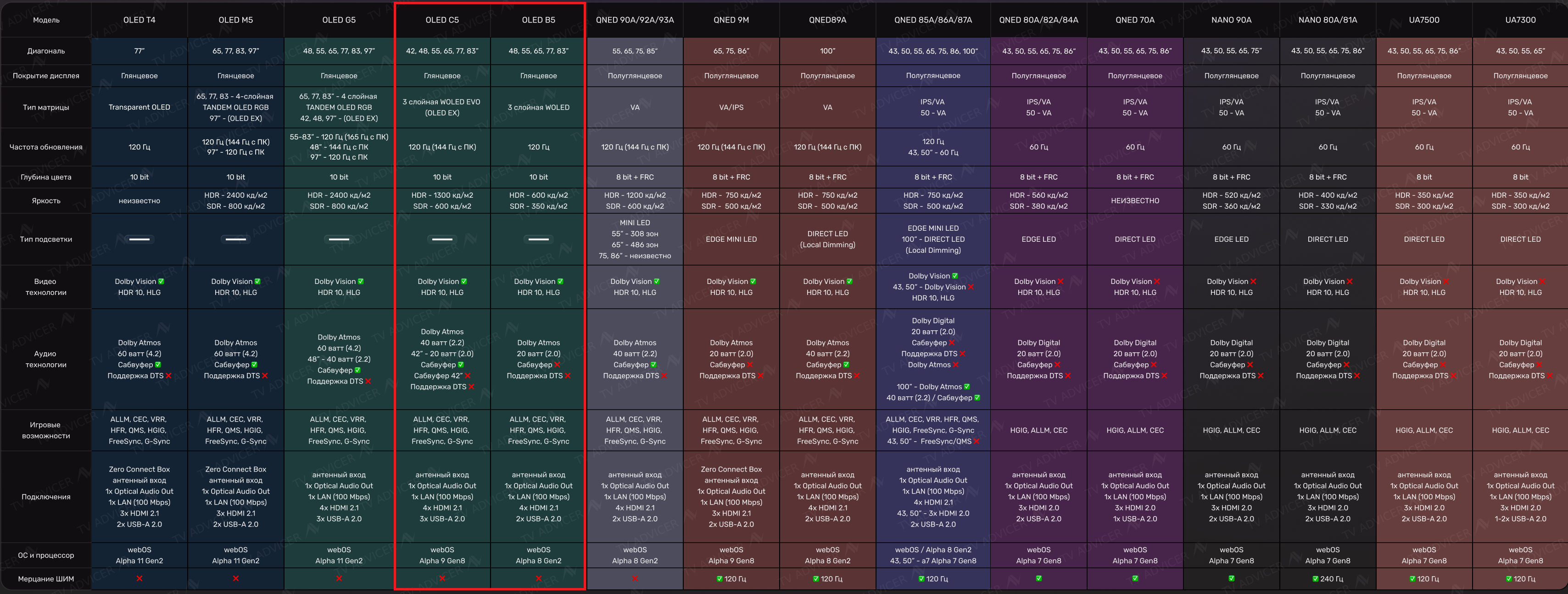 Смотреть надо все, и во всех значимых, кроме яркости в SDR, параметрах (объем цвета, результат работы с низкокачественным контентом) В5 лучше В4. А та разница в яркости SDR, что есть, не стоит предпочтения https://www.rtings.com/tv/tools/compare ... 8603/49540Malki писал(а):Из нового видео от TV ADVICER узнал, что B5 - это слегка упрощенная версия B4 с потерей DTS (хотя он мне и не нужен особо) и урезанной яркостью SDR. Для ютуба и обычных каналов нужно же именно на SDR параметр смотреть, а не на HDR? 350 кд/м2 будет хватать или это совсем мало даже для моего сценария использования?