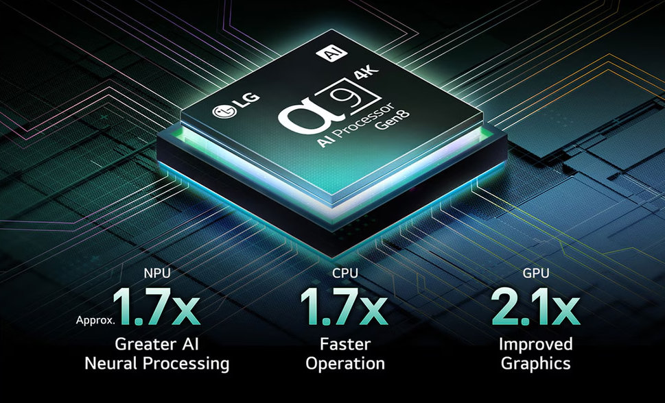 Модель QNED9M имеет аппаратную часть, построенную на процессоре обработки изображения LG ?9 Gen8 (Alpha 9 Gen8). Данный процессор пришел на смену предыдущему решению LG ?9 Gen 7 и отличается улучшенными алгоритмами обработки звука и изображения.