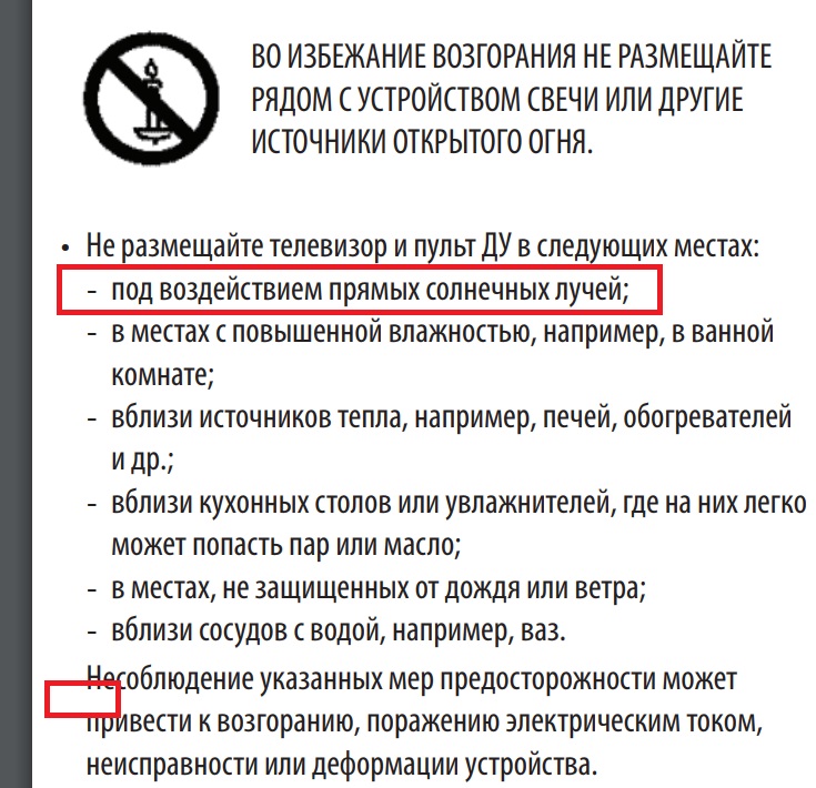 Полез в инструкцию. Мелким текстом в начале там вскользь написано, не размещать там, сям, в воду не бросать, детям не давать, на солнце не ставить, то есть это стандартный дисклаймер который пишут к 99% любых бытовых устройств. Далее в главе про установку ТВ, достаточно подробно и с картинками, но ни слова про опасность солнца для работающей матрицы OLED.