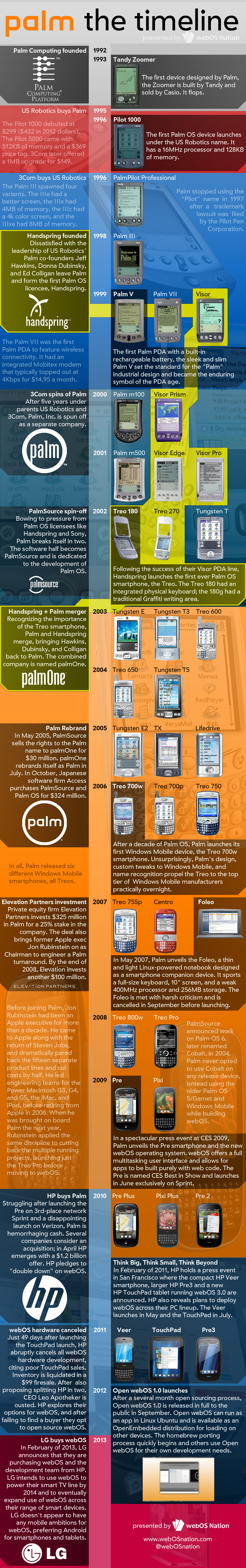 Чтобы понять, насколько долгим и извилистым был путь компании Palm и мобильной платформы webOS сайт webosnation.com представил свою временнУю шкалу. На протяжении двух десятилетий компания меняла названия и владельцев по меньшей мере девять раз, а также была разделена на две части трижды (PalmSource, HP engineering, LG) и соединялась в одно целое полтора раза.