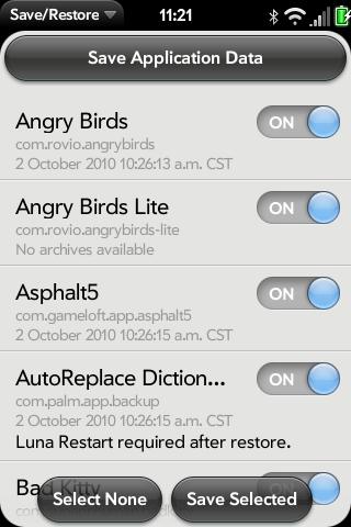 Важно! В связи с различной структурой файла PalmDatabase.db3 в разных версиях webOS, копировать и восстанавливать файл можно только в идентичной версии webOS.