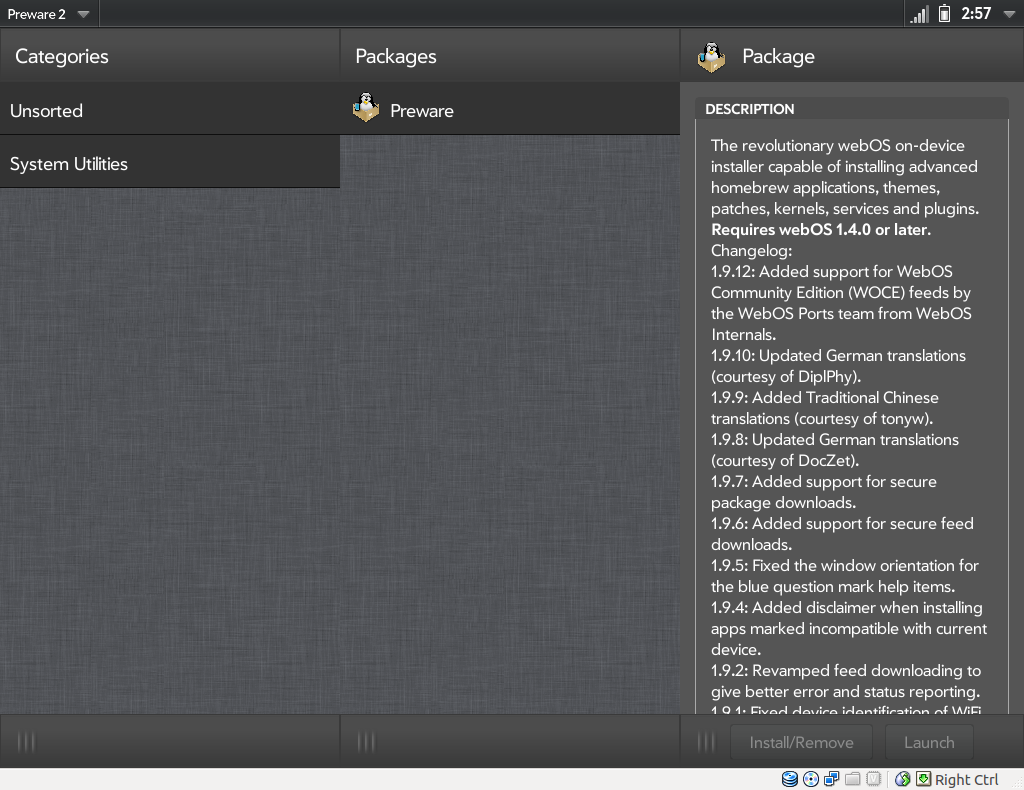Перерабатываемая командой webosinternals с использованием фреймворка EnyoJS версия Preware теперь сортирует и отображает информацию о пакетах приложений (packages).