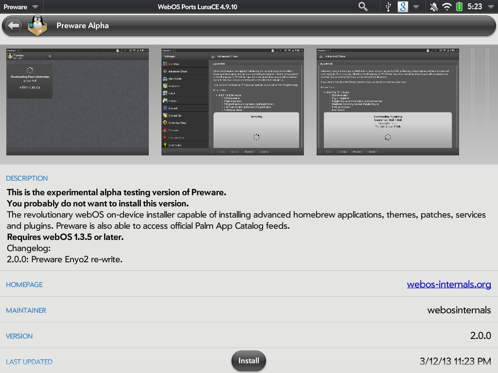 Радостная новость. В настоящее время идет процесс переписывания Preware с использованием фреймворка EnyoJS. После его окончания программа станет быстрее, красивее, экранонезависимой и еще много чего интересного.
