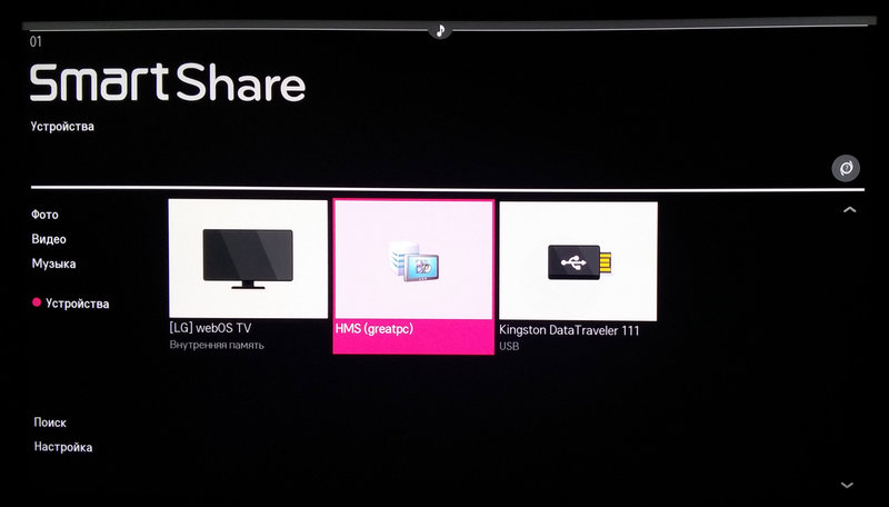 Чтобы запустить свой домашний медиа-сервер DLNA, достаточно нажать на кнопку в верхнем меню программы "Запустить". Берите телевизионный пульт в руки, запускайте на ТВ SmartShare и выбирайте из списка свой медиа-сервер (в нашем случае hts (greatpc)) .
