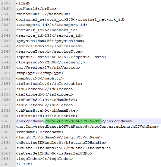 Название каналов цифрового телевидения (DTV) хранится в шестнадцатеричном виде между тегами <hexVchName> </hexVchName>.