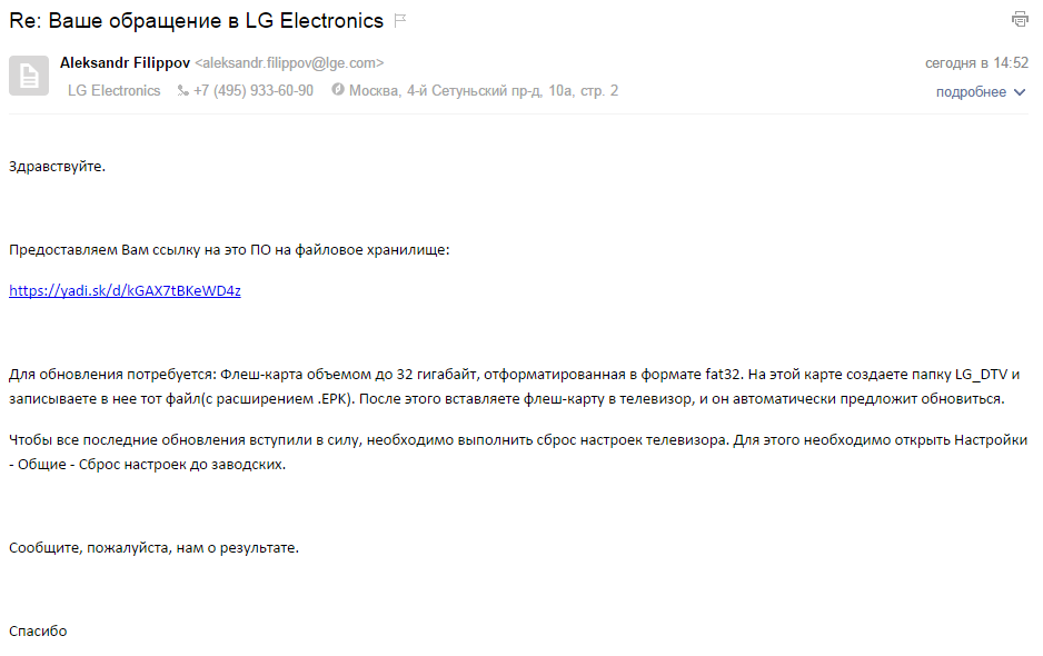 Хороший совет в ответе от LG с рекомендацией по сети в настройках ТВ найти это новое обновление и обновиться до версии ПО 04.41.36, которого никогда не было в доступе. :shock: А про версию webOS 2.0, что разработчики ее тестируют для моделей 2014 года, это вообще бред, не будет этой версии 2.0 на эти модели, и забудьте ее, она будет только на моделях 2015 года. :)