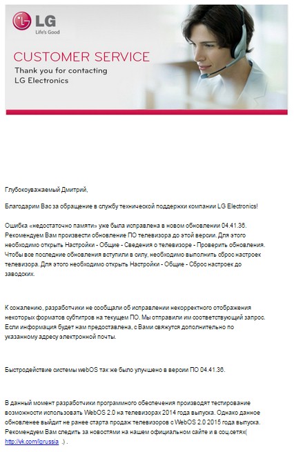 dmitriypr писал(а):Списался я сегодня со службой поддержки LG и задал вопросы о том когда же исправят проблему с нехваткой памяти. Мне сказали что разработчики это исправили на прошивке версии 4.41.36. В ответ я написал о том что эта версия прошивки недоступна для моего тв на сайте LG, мне ответили следующее: