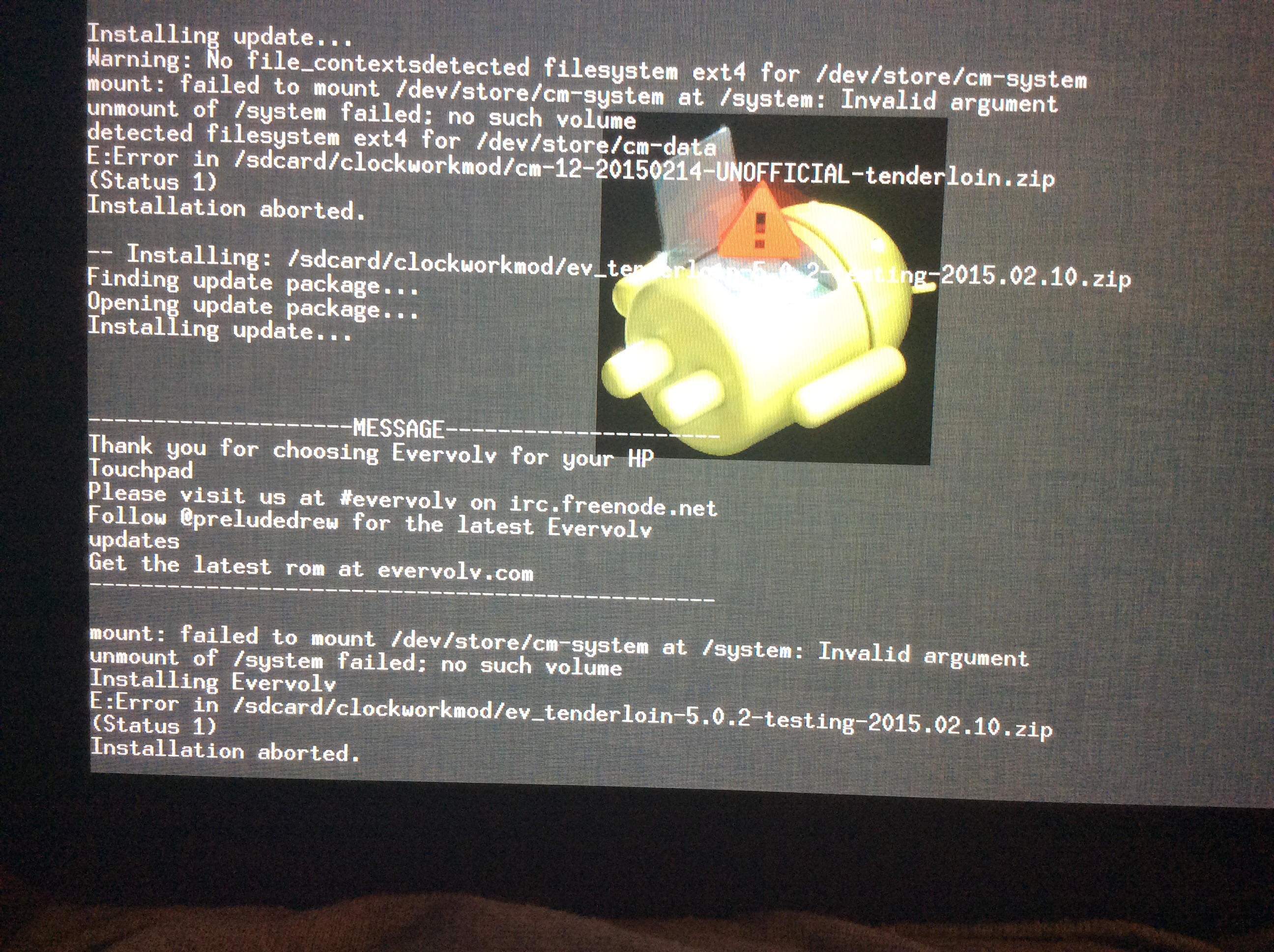 Добрый день. Вчера тоже пытался обновиться на леденца. Получилось только с использованием Touchpad Toolbox версии 42 с компа. Сама прошивка, как у вас - ev_tenderloin-5.0.2-testing-2015.02.10.zip Гапсы брал тут - https://s.basketbuild.com/gapps Для 5-го андроида. Рекавери 2.8.4.0 TWRP recovery with MTP support На компе должны стоять драйвера и службы от новаком. Брал файлик для установки(novacom-win-64.tgz) тут. Дальше по инструкции. Там все расписано на аглицком.