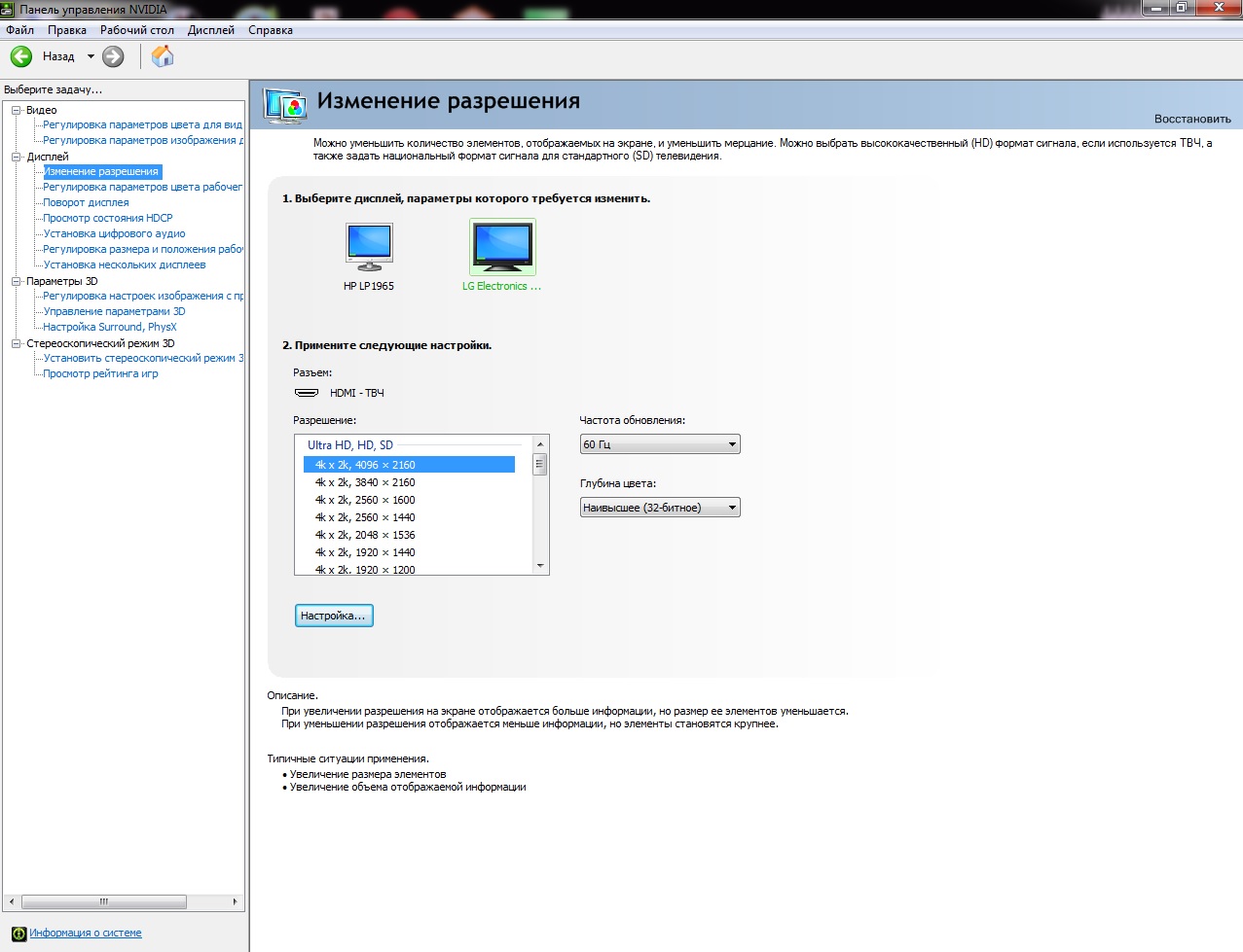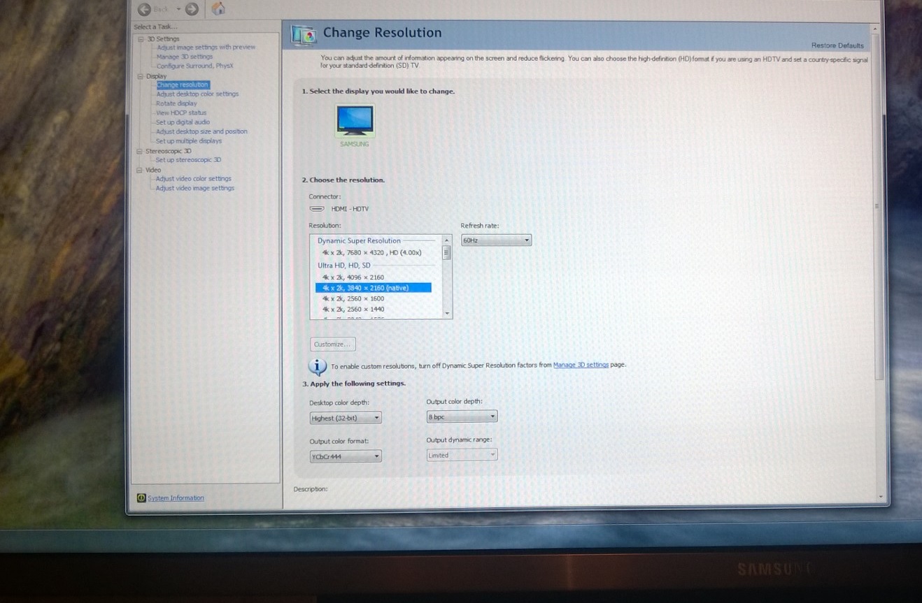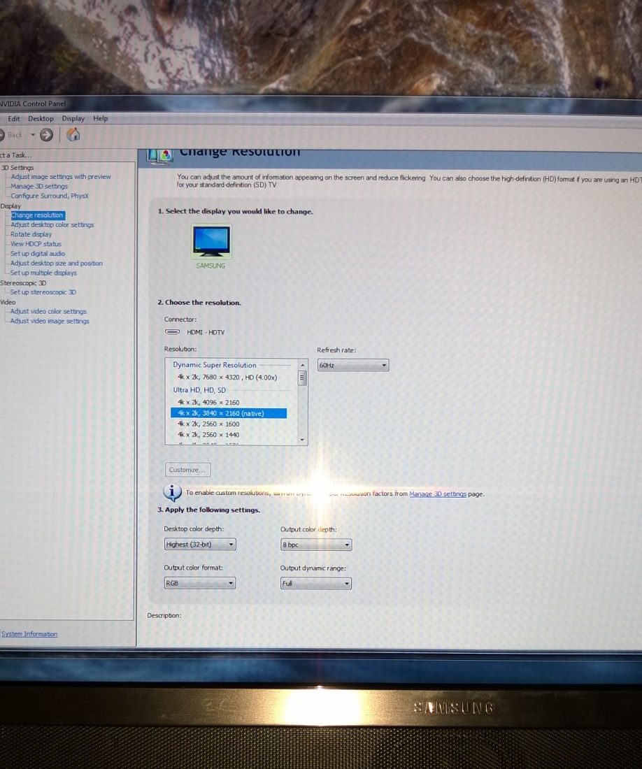 Предлагаю тут отписываться тем, кто успешно смог подключить свой ПК к ТВ в режиме 4К 60Гц 4:4:4 по проводу HDMI v2.0. Считаю что это в будущем поможет многим кто захочет присоединиться к обладателям 4К телевизоров. Чтобы не быть голословными, отписывающимся, предлагаю прикладывать скриншот из NVIDIA Control Panel, раздел Dysplay - Change resolution, где будет видно какое разрешение установлено на ТВ и режим RGB или YCbCr444. Также, думаю не лишнем будет указать какая используется видеокарта и провод HDMI (длина и фирма производитель).