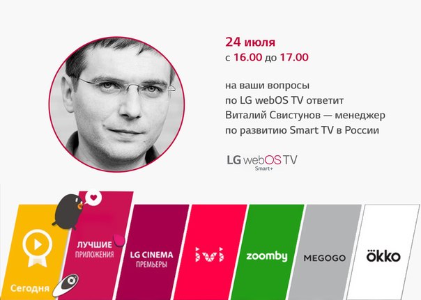 Завтра с 16 до 17 часов по Москве на волнующие вас вопросы о webOS TV готов ответить наш специалист - Виталий Свистунов, менеджер по развитию Smart TV в России.