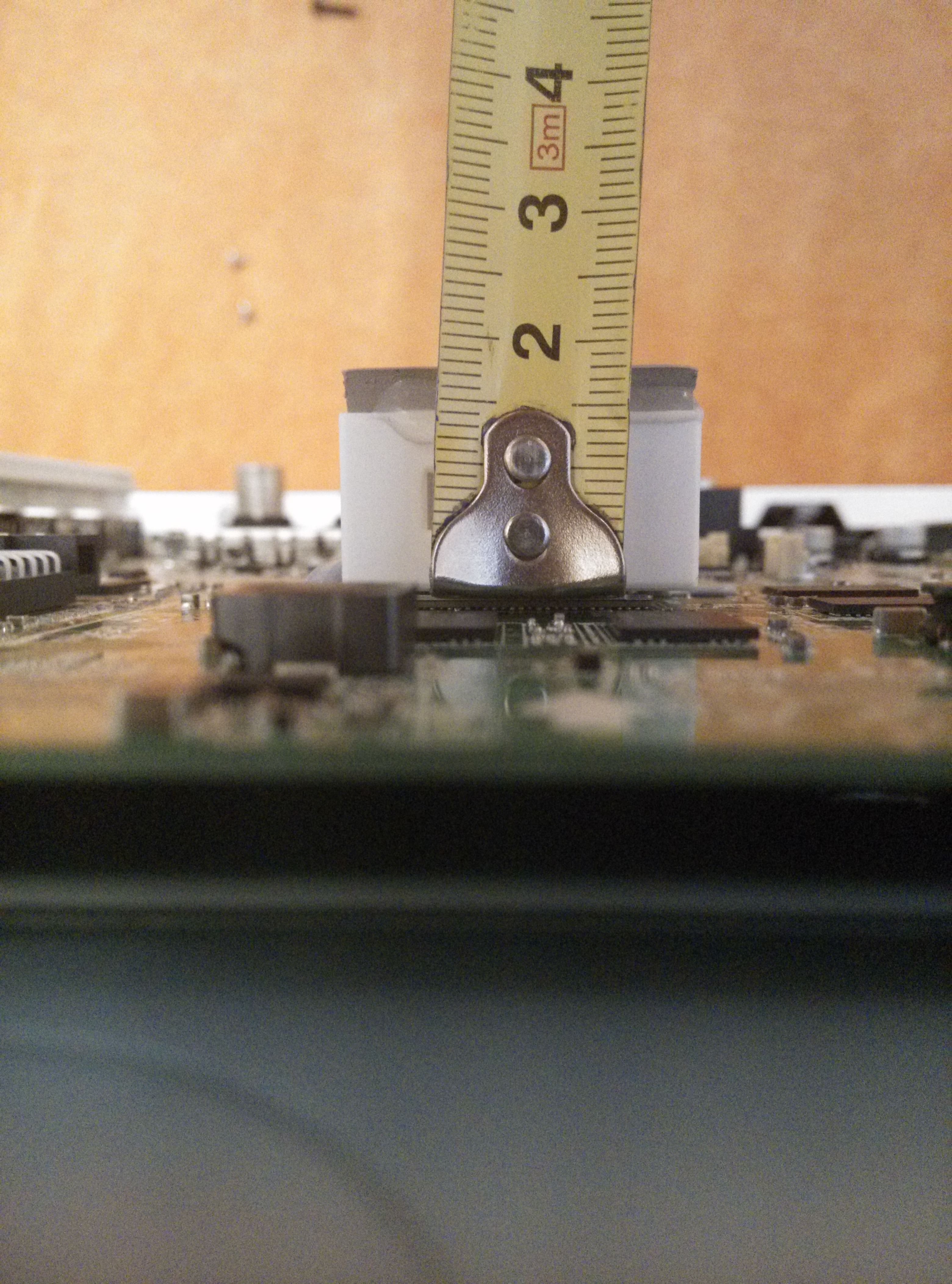 ниже виднеется "радиатор" процессора в виде прямоугольника с прорезью посередине для вертикального продува (прорезь закрыта рулеткой) посаженый на термоклей к процу