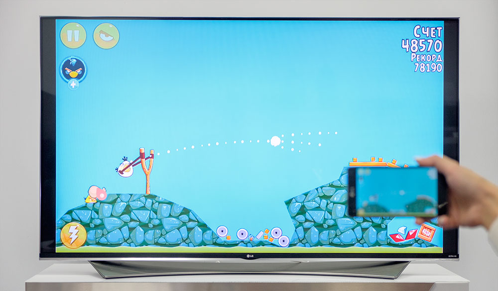 Функция передачи изображения со смартфона/планшета под управлением Android на телевизор существует уже несколько лет. Она позволяет, например, показать фото или видео, а также вывести на большой экран ход игры. Однако играть вслепую крайне неудобно, а транслировать свою игру для друзей хотя и приятно, но быстро надоедает. Телевизоры LG с webOS обеспечивают совершенно иной подход к играм (да и любым другим Android-приложениям). Чтобы управлять ими, не нужно касаться дисплея: курсор пульта Magic на экране телевизора заменяет палец на смартфоне. Смартфон может спокойно лежать рядом, а все действия выполняются, глядя на большой экран.