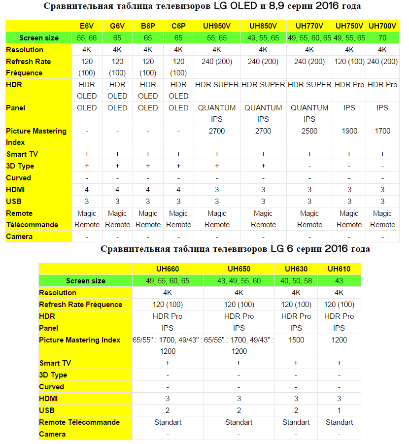 Сравнительные таблицы телевизоров LG, где наглядно можно посмотреть различия между моделями 2016 года: