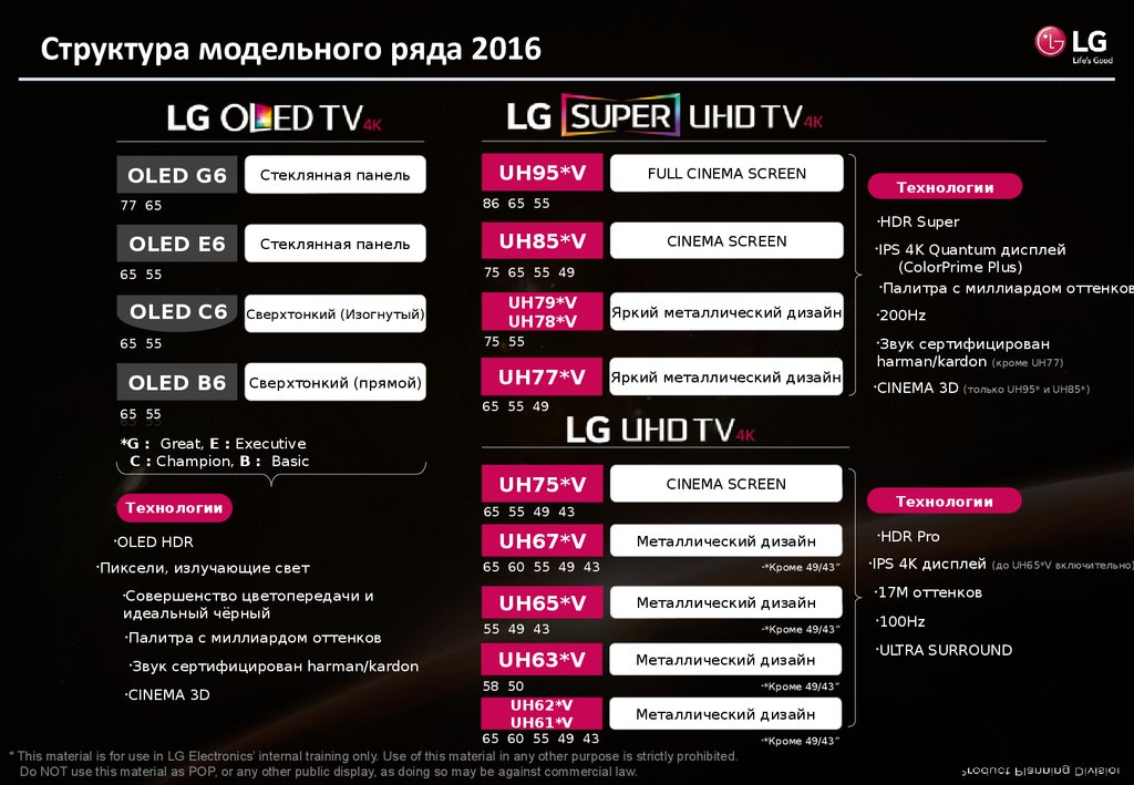 Традиционно телевизоры LG делят на серии (см. также модели 2014 и 2015 года). Обозначение модели может изменяться в разных странах, но не значительно, основной принцип доступных функций и параметров будет практически неизменный: