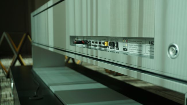 То, что LG сделала в серии R - это совместила естественную гибкость OLED с базой, которая действует одновременно как хранилище, механизм разворачивания и звуковая. Все входы и выходы вынесены в заднюю часть базы, а сама она расположена на простой белой подставке, которая поставляется с каждым 65R1.