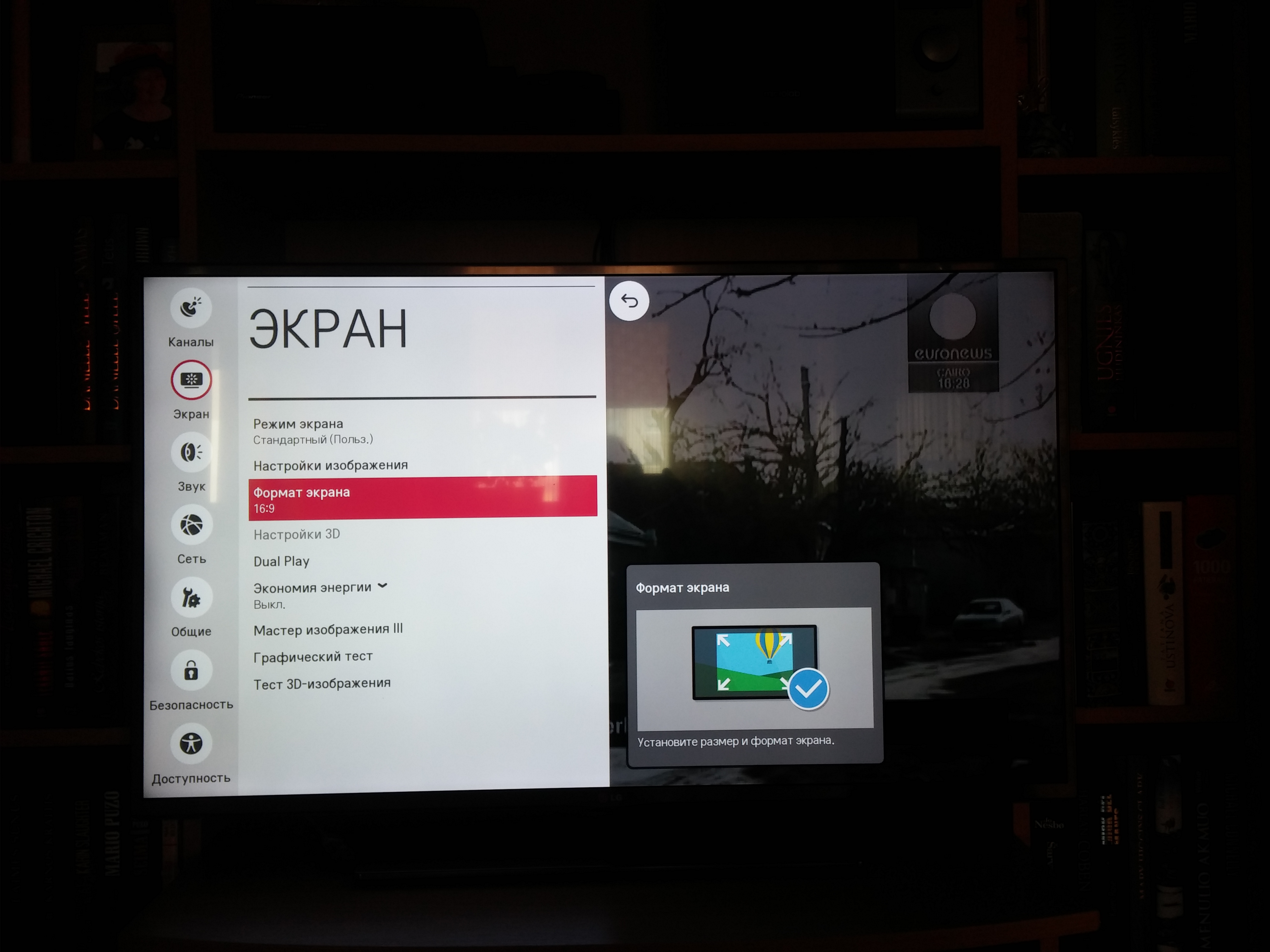 Но такой широкий выбор настроек работает только для кабельного (антенного) источника изображения. Однако, даже тут принудительно сжать изображение по вертикали (до образования черных полосок) не получится. Насколько я понимаю, так было задумано.