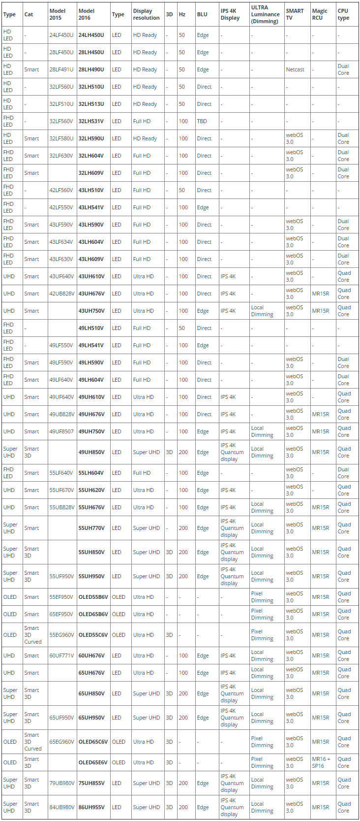 PDFка с характеристиками моделей ТВ LG 2016 года.