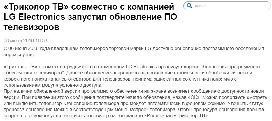 mixmar писал(а):Кстати, вот тут http://vladimir.tricolor.tv/dealers/news/6621 есть информация, что теперь для обновления не обязательно иметь интернет подключение, это у кого используются модули с картой на ТВ от Триколор, новые прошивки можно будет получать через спутник. Как это будет на самом деле, далее увидим на что способны LG.