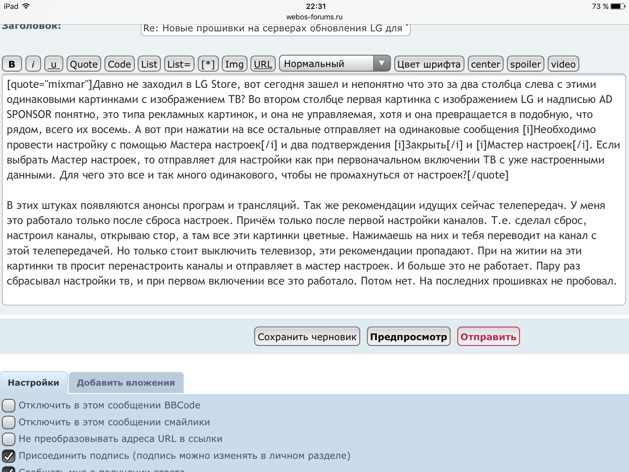 mixmar писал(а):Давно не заходил в LG Store, вот сегодня зашел и непонятно что это за два столбца слева с этими одинаковыми картинками с изображением ТВ? Во втором столбце первая картинка с изображением LG и надписью AD SPONSOR понятно, это типа рекламных картинок, и она не управляемая, хотя и она превращается в подобную, что рядом, всего их восемь. А вот при нажатии на все остальные отправляет на одинаковые сообщения Необходимо провести настройку с помощью Мастера настроек и два подтверждения Закрыть и Мастер настроек. Если выбрать Мастер настроек, то отправляет для настройки как при первоначальном включении ТВ с уже настроенными данными. Для чего это все и так много одинакового, чтобы не промахнуться от настроек?