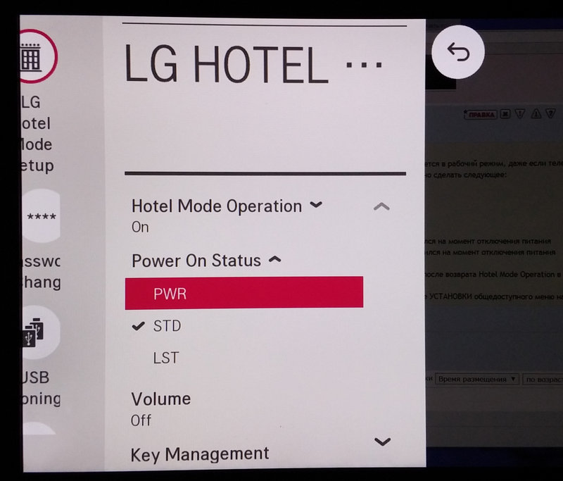 Изменения вступают в силу после перезагрузки телевизора. В ряде случаев эффект сохраняется и после возврата Hotel Mode Operation в положение No.