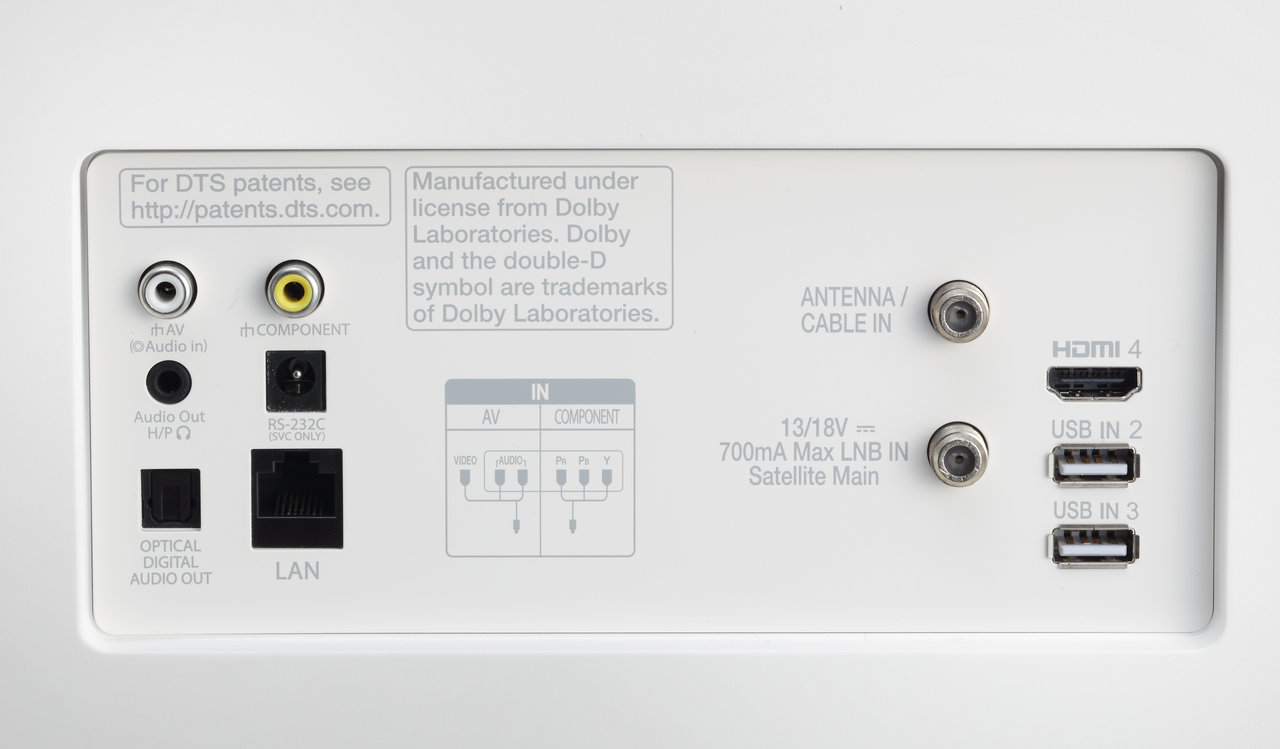 Задняя панель телевизора LG SJ950V оснащена следующими интерфейсами: два входа HDMI, 2 антенных входа (для спутникового и кабельного/эфирного ТВ), компонентные входы по видео/аудио, а также по одному порту LAN (со скоростью 100 Мбит/сек) и USB (версии 2.0). Что касается аудио, то на этой же панели расположен оптический аудиовыход и разъем для наушников.