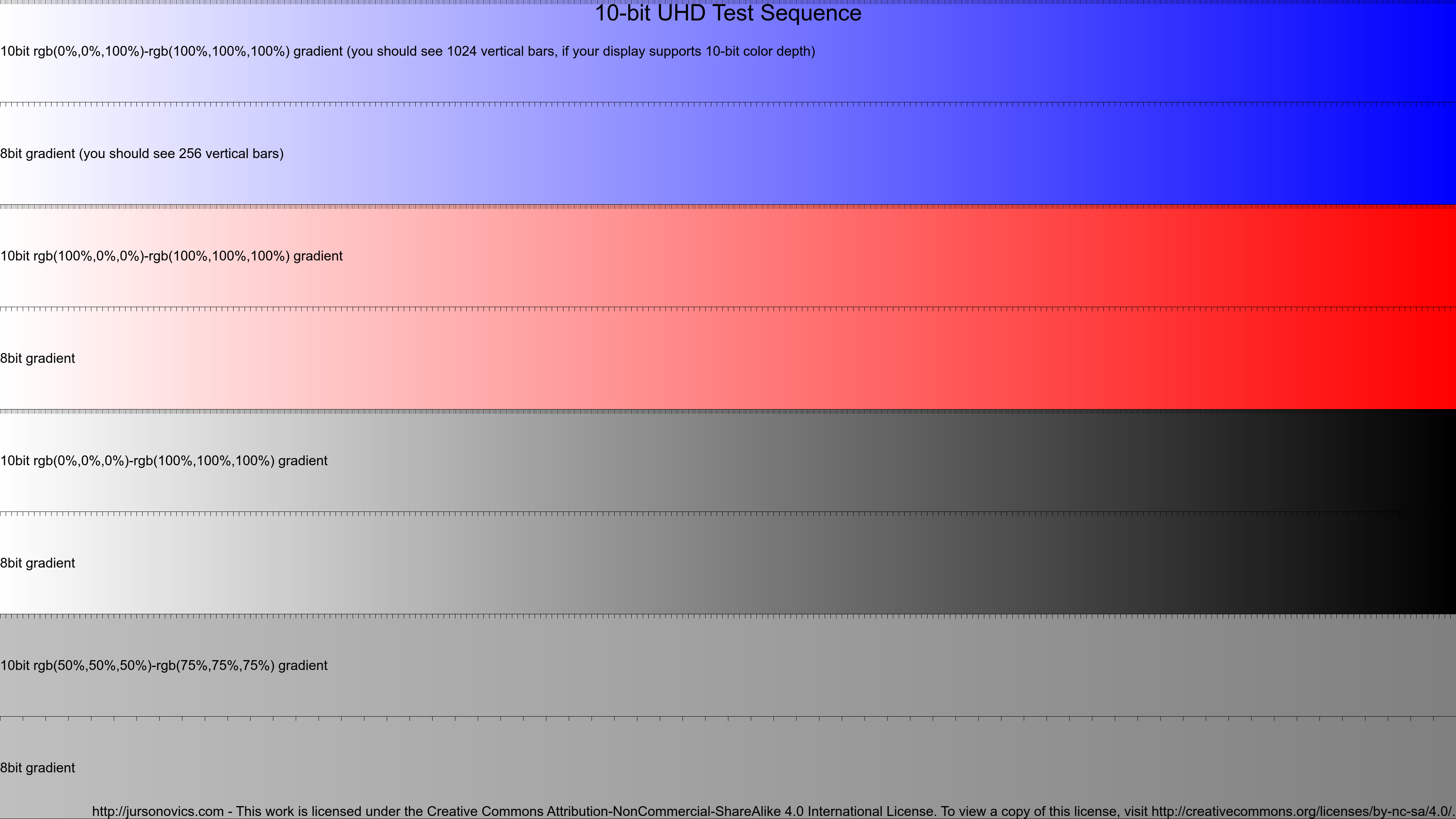 Попробуйте еще эти тесты на 10-битность матрицы (градиенты должны сливаться в сплошную линию, без ступенек и видимых полос, 2 теста по 2 формата):