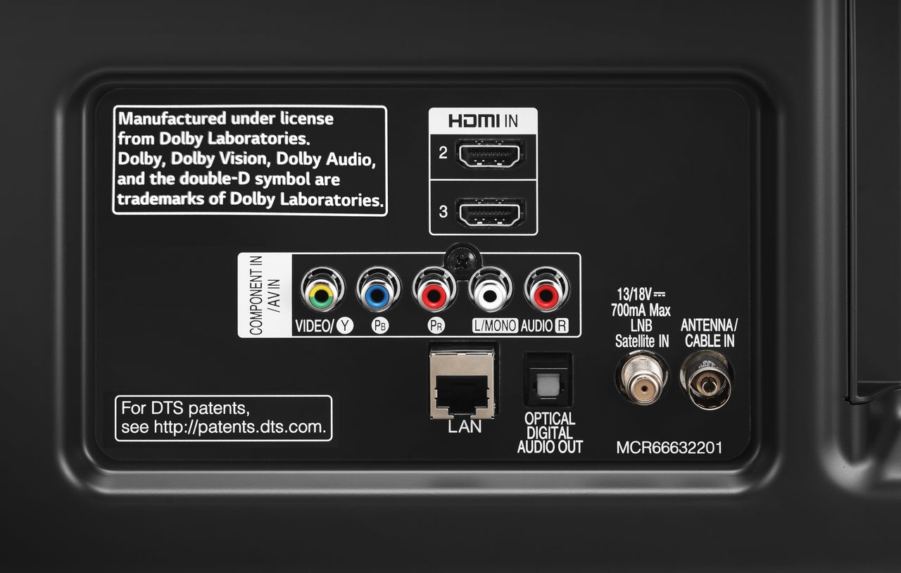 Задняя панель телевизора LJ615V оснащена следующими интерфейсами: два входа HDMI, 2 антенных (спутник/кабель) входа, компонентные входы по видео/аудио и 1 порт LAN. Что касается аудио, то на этой же панели расположен только оптический аудиовыход, а стерео выход для наушников и выход аудио RCA (тюльпан) на два канала, как в моделях 2016 года, отсутствуют.