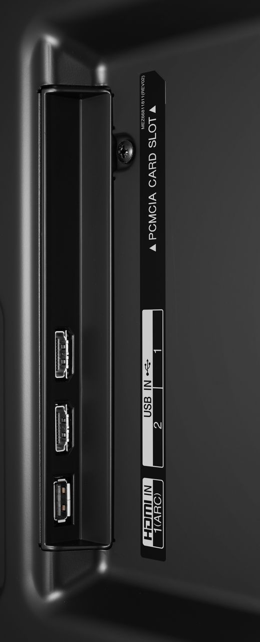 Боковая панель оснащена одним HDMI (ARC) входом и двумя разъемами USB 2.0. Кроме того на борту имеется встроенный Wi-Fi и слот условного доступа CI.