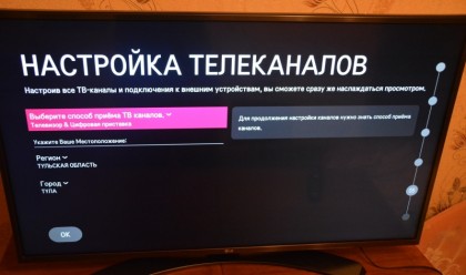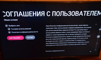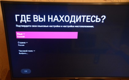 Первое включениеДля первичной настройки я собрал телевизор на ножке. Первое включение прошло довольно-таки быстро. Секунд пять-шесть висел логотип LG, потом примерно столько же - логотип webOS и включился экран, предлагающий настроить телевизор "под себя".