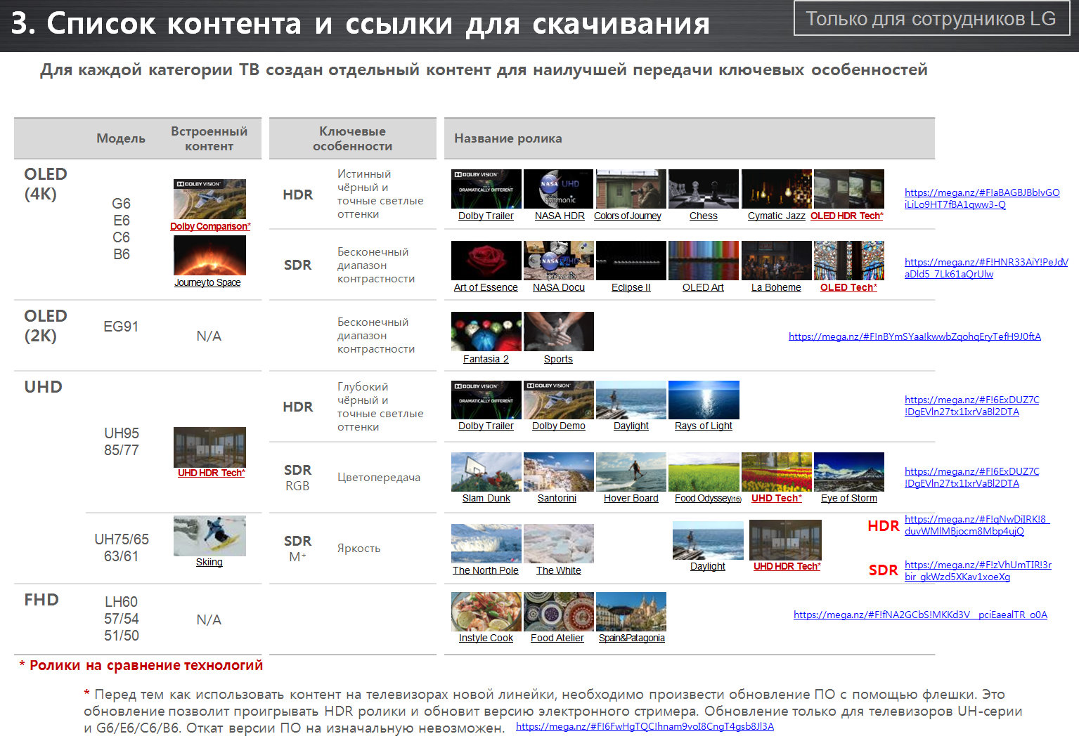 https://mega.nz/#F!6ExDUZ7C!DgEVln27tx1IxrVaBl2DTAhttps://mega.nz/#F!aBAGBJBb!vGOiLiLo9HT7fBA1qww3-QОбратите внимание, что ролики в формате HDR (HDR10/DV10) имеют _H_ в имени файла, _O_ означает OLED, _L_ - ЖК, а _N_ обычный SDR.