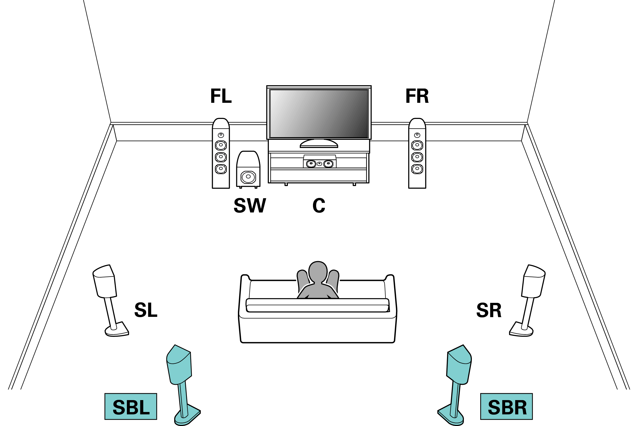 В 5.1 присутствует: центральный канал, фронтальные каналы, и сурраунд каналы - каналы окружающего звука, и сабвуфер.