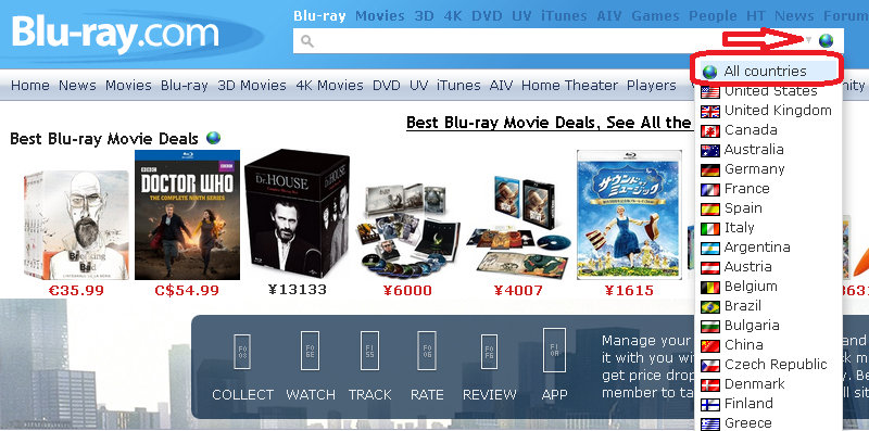 - Поиск российских изданий возможен и на самом http://www.blu-ray.com. В верхней части главной страницы сайта в строке поиска выбираем "Russia" с помощью серого треугольника, как показано на рисунке. Далее выбираем интересующий нас формат ("iTunes", "Blu-ray", "3D" или "4K") и в поисковой строке вводим оригинальное название фильма (в подавляющем большинстве случаев - на английском языке). Внимание! Кириллица в поиске на сайте blu-ray.com не поддерживается. Допускается поиск по неполному названию.