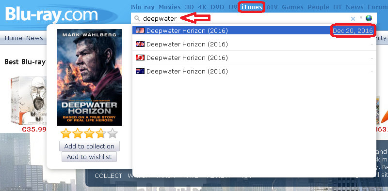 - Если нас интересует дата релиза цифровой копии в магазине iTunes, то над строкой поиска выбираем соответствующую надпись, а в самой строке вводим оригинальное название искомого фильма (в подавляющем большинстве случаев - на английском) как показано на рисунке. Внимание! Кириллица в поиске на сайте blu-ray.com не поддерживается. Допускается поиск по неполному названию.