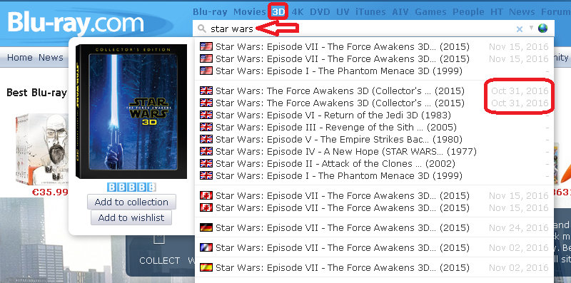- Если нас интересует дата релиза сугубо Blu-ray 3D издания, то над строкой поиска выбираем "3D", а в самой строке вводим оригинальное название искомого фильма (в подавляющем большинстве случаев - на английском) как показано на рисунке. Допускается поиск по неполному названию.